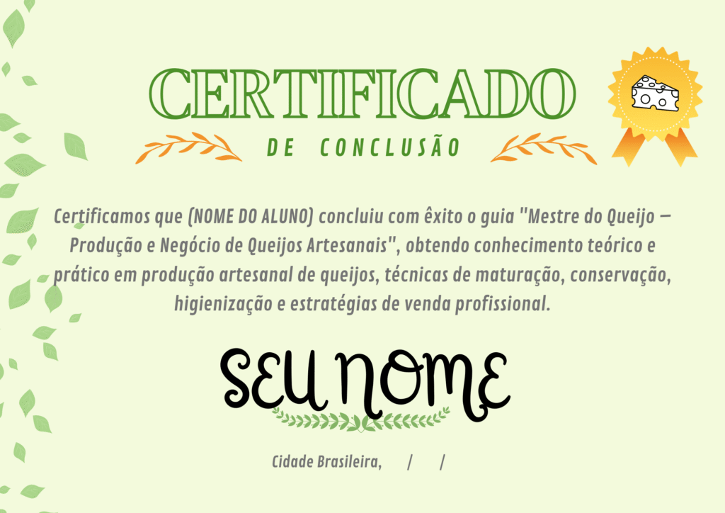 Ao concluir, você receberá seu Certificado Oficial de Conclusão, que comprova sua capacitação profissional como produtora de queijos artesanais.
